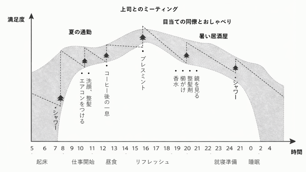 人は一日のなかで、快適な領域とその外側を微細に行き来している。満足度は揺れ動き、小さな介入によって回復する。その揺らぎを観察することが、UXの出発点でした。